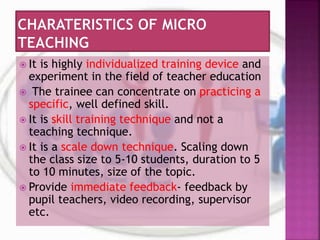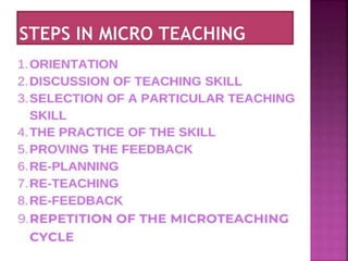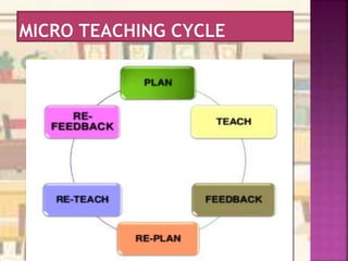 Microteaching is a technique used to train teachers by having them teach short lessons to small groups of students. It allows trainees to focus on practicing and improving specific teaching skills. The process involves selecting a skill to practice, teaching a short lesson to peers while being recorded, receiving feedback, reteaching with adjustments based on the feedback, and repeating until the skill is mastered. By scaling down the class size, lesson length, and topic, microteaching provides trainees an opportunity to experiment with their teaching and quickly incorporate suggestions for improvement.