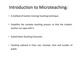 The document presents an overview of microteaching, a teacher training method that simplifies the teaching process by reducing class size, lesson time, and focusing on specific teaching skills. It outlines the components, process, and advantages of microteaching, highlighting its effectiveness in enhancing teacher performance and facilitating feedback. The microteaching cycle includes planning, teaching, receiving feedback, and re-teaching, with an example lesson on galaxies.