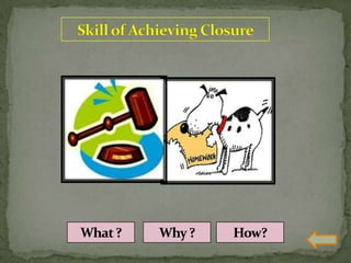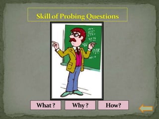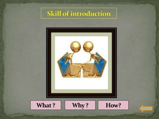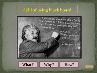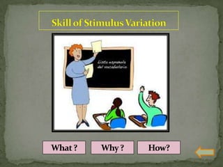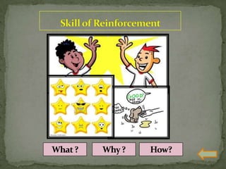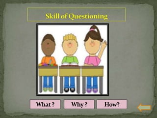 The document discusses various teaching skills including questioning skills, reinforcement, stimulus variation, explanation, blackboard usage, achievement of closure, probing questions, and link practice. It provides descriptions of each skill, their purpose, components, and dos and don'ts. Link practice involves integrating multiple skills together and bridging the gap between microteaching and real classroom teaching.