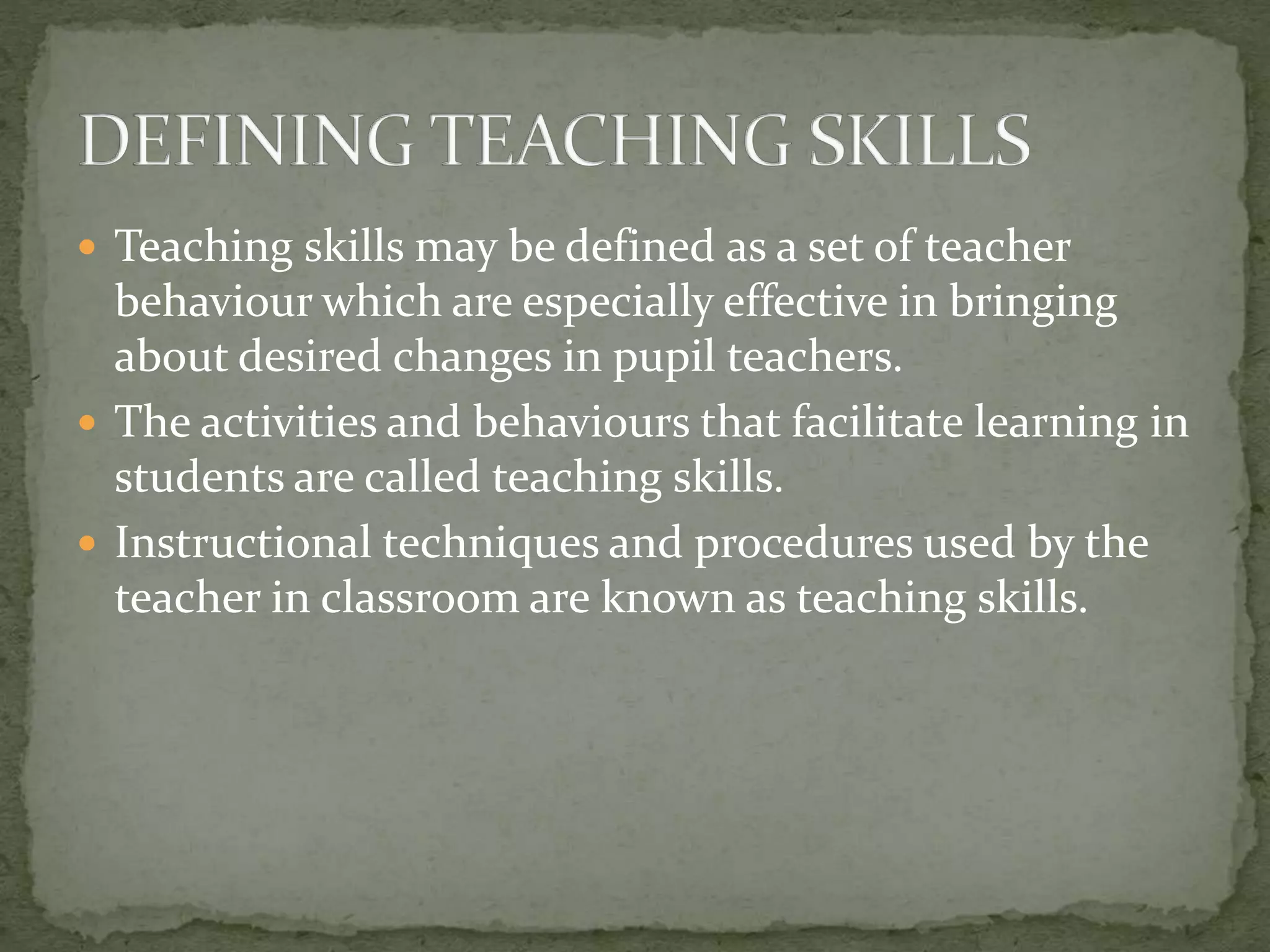 The document discusses teaching skills and their components. It defines teaching skills as behaviors that facilitate learning in students. The core teaching skills discussed are explanation, stimulus variation, questioning, response management, illustration, and reinforcement. Each skill is defined and its desirable and undesirable behaviors are outlined. The document also discusses skills related to introducing a lesson, explaining concepts, questioning students, managing student responses through probing, using reinforcement, and utilizing the blackboard effectively.