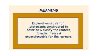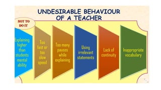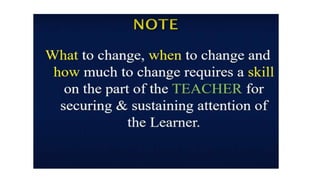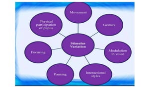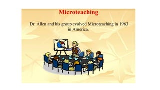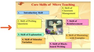 This document discusses the concepts and skills of microteaching. It begins by defining microteaching as teaching a single concept or skill to a small group of students for a short period of time. It then outlines the agenda which includes the core skills of microteaching, designing a microteaching plan, presenting a microlesson, and the concept of microteaching. Several of the core skills are then described in more detail, including questioning skills, explanation skills, and stimulus variation skills. Guidelines are also provided for designing an effective microteaching plan.