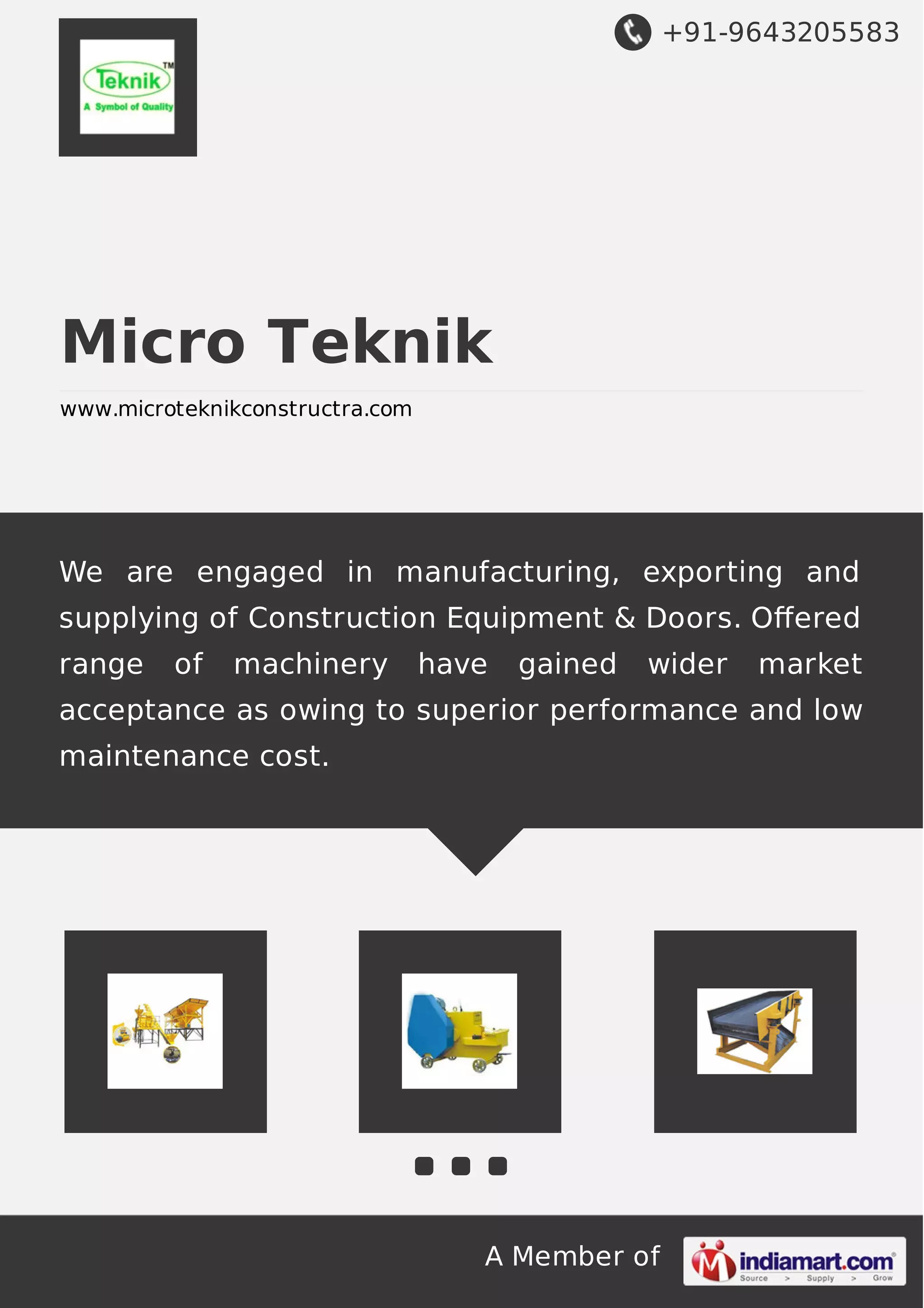 Micro Teknik is a manufacturer, exporter, and supplier of construction equipment and doors established in 1967. It offers a range of products including concrete batching plants, construction screening machines, block making machines, and reversible concrete mixers. Micro Teknik prides itself on quality components, advanced technology, and assisting customers with their needs.
