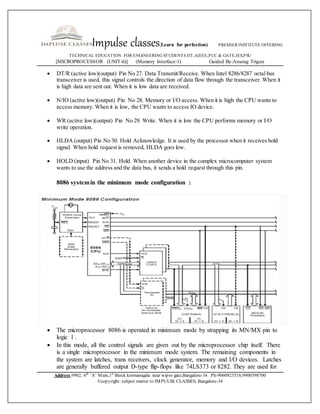 The document provides information about Impulse Classes, a premier institute offering technical education. It includes details about various courses offered related to engineering exams like IIT, AIEEE, PUC, GATE, and IES. It also provides sample questions and explanations related to the working of the 8086 microprocessor in minimum and maximum modes. Specifically, it discusses the pin descriptions and timing diagrams for memory read, write, and I/O write operations of the 8086 microprocessor. It provides block diagrams and explanations of the 8086 operating in minimum and maximum modes with the necessary support components.