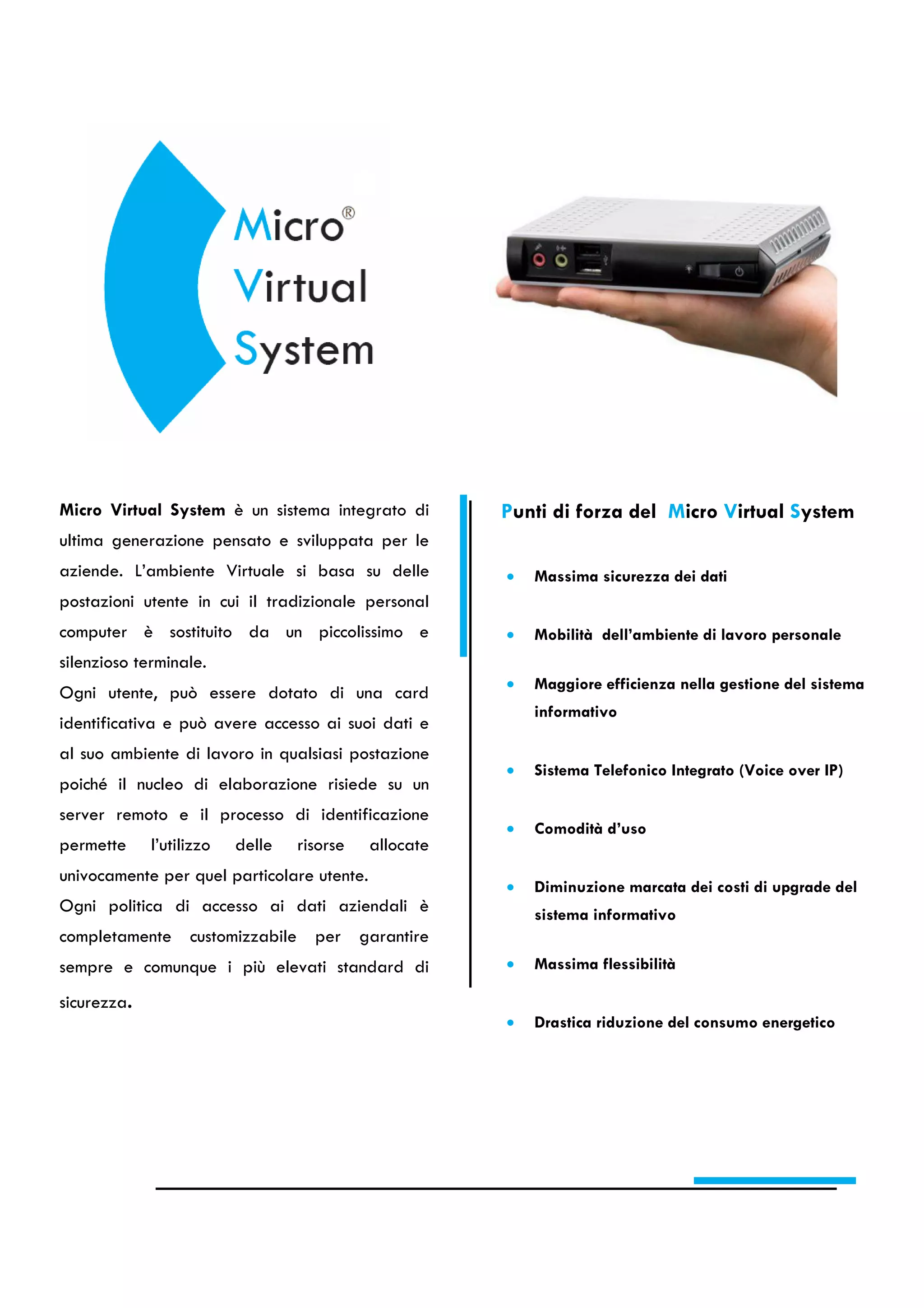 Il sistema Micro Virtual System è una soluzione innovativa per le aziende, progettata per ottimizzare la gestione dei dati e ridurre i costi operativi. Basato su un'infrastruttura centralizzata, offre massima sicurezza dei dati, mobilità sul posto di lavoro e integrazione di servizi telefonici. Inoltre, consente un notevole risparmio energetico e semplifica l'amministrazione delle postazioni di lavoro.