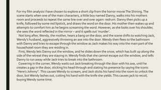 Danny wakes up his mother Wendy by repeating the word "redrum" and writing it on the door with lipstick. Wendy realizes it spells "murder" backwards in the mirror. Jack begins aggressively attacking the bathroom door with an axe where Wendy and Danny have fled. Wendy escapes out the window but is unable to get Danny to safety before Jack breaks through. Jack threatens Wendy through a hole in the door before she cuts his hand with a knife.