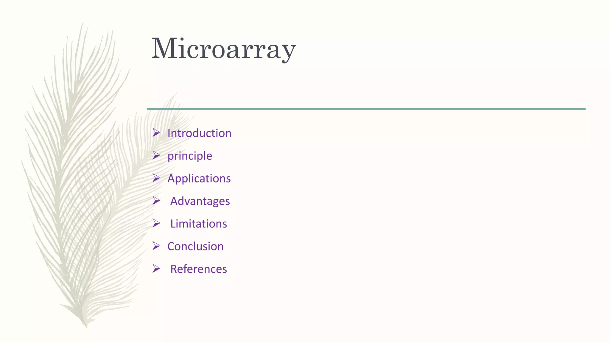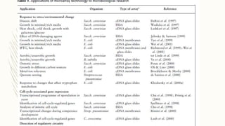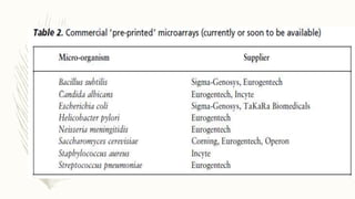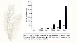 DNA microarrays, also known as DNA chips, are solid supports used to analyze gene expression by hybridizing complementary DNA sequences, allowing simultaneous assessment of thousands of genes. They have various applications including disease diagnosis, drug discovery, and microbial detection, but face limitations such as high costs, complex data analysis, and a short shelf life. Despite these challenges, DNA microarray technology is a significant advancement in genomics, enabling researchers to uncover the functions of numerous genes in one experiment.