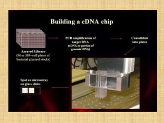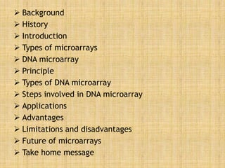 Microarrays allow researchers to study gene expression across thousands of genes simultaneously. They work by hybridizing labeled cDNA or cRNA to probes attached to a solid surface, then detecting and quantifying the hybridized genes. The document outlines the history and development of microarray technology. It describes the key steps in a DNA microarray experiment including tissue collection, RNA isolation, cDNA synthesis, hybridization to the array, scanning, and data analysis. Applications include studying gene expression in health and disease, drug development, and pharmacogenomics. Advantages are the ability to study many genes at once, while limitations include expense and complexity of data analysis.