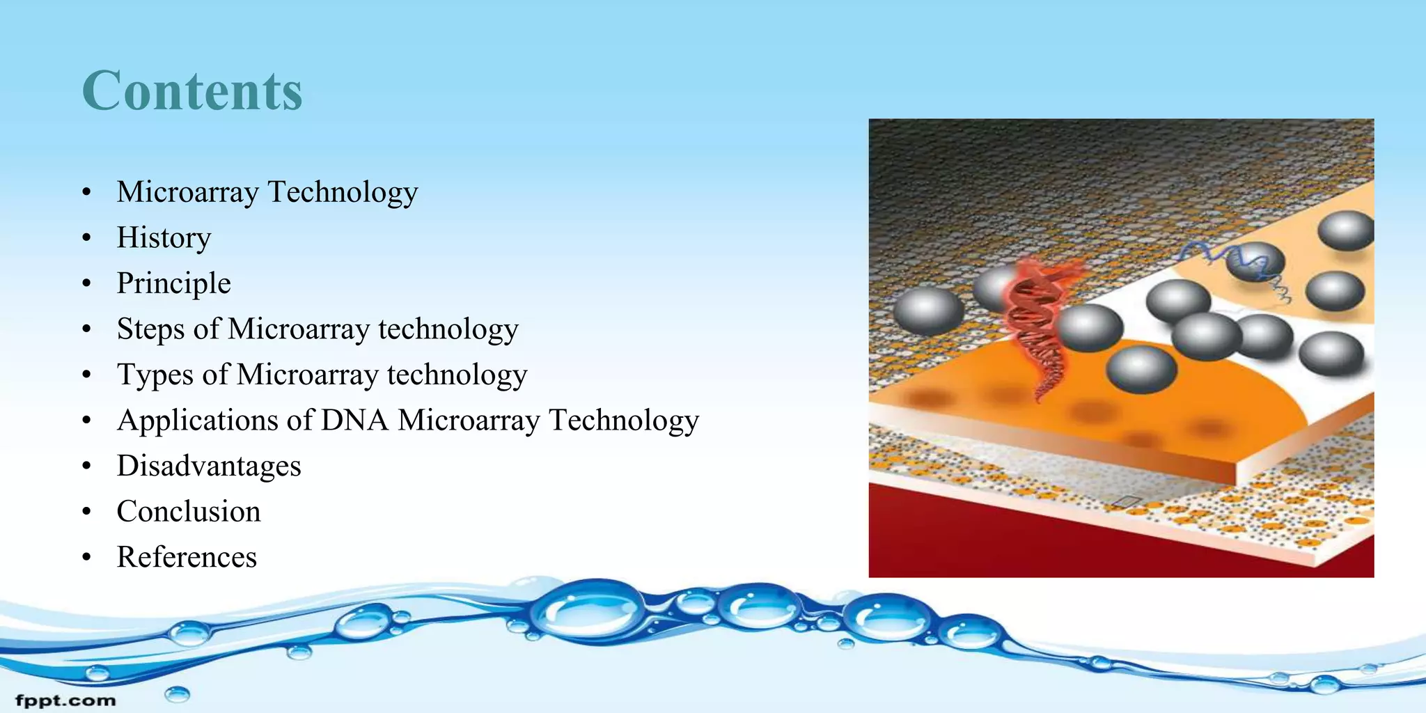 Microarray technology allows researchers to study the expression of thousands of genes simultaneously. It involves placing short DNA sequences from known genes onto a glass slide in a controlled array. Researchers apply fluorescent-tagged DNA or RNA samples to the array to see which sequences bind, indicating gene expression. Microarrays can be used for gene expression profiling, comparative genomics, disease diagnosis, drug discovery, and toxicology research. They allow analysis of entire genomes quickly and efficiently. However, microarrays are costly to produce and analyze, and the chips have a limited shelf life.