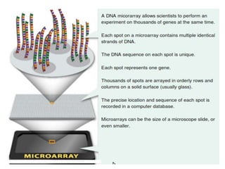 The document provides an introduction to DNA microarrays, detailing their composition, fabrication methods, and principles, including hybridization and quantitation of nucleic acid sequences. It discusses various applications such as gene expression profiling, drug development, pharmacogenomics, and comparative genomic hybridization, highlighting their significance in biomedical and clinical research. The advantages of microarrays include comprehensive genomic-wide information at relatively low costs and the ability to monitor gene expression patterns under different conditions.