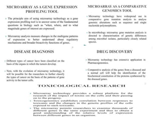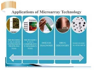 Microarrays allow researchers to analyze gene expression across thousands of genes simultaneously. There are three basic types of microarrays: spotted arrays where DNA is physically deposited on a slide; self-assembled arrays using beads containing oligos in pits on a surface; and in-situ synthesized arrays produced by inkjet oligo synthesis or photolithography. Quality control is important at multiple levels including the probe, array, and gene levels to identify unreliable measurements and ensure only high quality data is used in analysis.