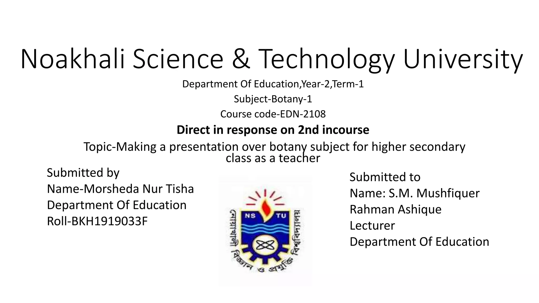 This document contains information about a presentation on botany that a student named Morsheda Nur Tisha is preparing for a higher secondary class. It includes sections on microbiology, types of microorganisms, characteristics of living organisms, viruses, the structure and replication of viruses, bacteria, the structure of bacteria, and the economic and biological importance of viruses and bacteria.