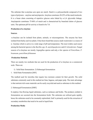 Microbial α-amylase production is important industrially and can be done through solid state or submerged fermentation. α-Amylase is an enzyme that hydrolyzes starch into simpler sugars and is commonly produced through microbial fermentation using Bacillus species. The production process requires optimization of temperature, pH, moisture levels and duration to achieve high enzyme yields. Downstream processing such as precipitation and chromatography is used to recover and purify the α-amylase enzyme.