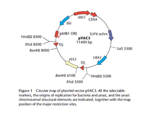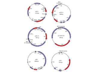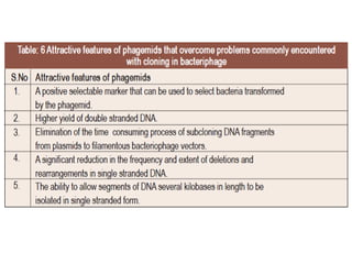 This document discusses vector systems used in genetic engineering. It describes some key features an ideal vector should possess, including an origin of replication, selectable marker gene, unique restriction sites, small size, and expression control elements. It distinguishes between cloning vectors, meant to isolate or multiply insert DNA, and expression vectors, meant for expressing transgenes. Shuttle vectors contain origins of replication for two different hosts. The document also summarizes bacteriophage lambda's life cycle and genome organization, noting how its non-essential central region can be deleted or replaced to construct cloning vectors.