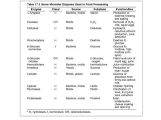 Microbial enzymes have several advantages for food processing including producing specific products through single step reactions and allowing control over reactions. Common enzymes used include amylases, catalase, cellulases, invertase, lactase, lipases, and proteases. Recombinant DNA technology has improved enzyme efficiency by allowing production in bacterial sources. Immobilized enzymes can be recycled but may have reduced activity. Thermostable enzymes are advantageous for food processing as they allow increased production rates and reduced contamination risks. Methods to improve enzyme thermostability include gene cloning and computer modeling to modify amino acid sequences. Enzymes can also help treat food waste by breaking down polysaccharides, proteins, and other materials for conversion to valuable products like
