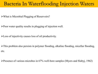 Microbial plugging of reservoirs by bacteria in waterflooding injection waters can cause poor injectivity and loss of oil productivity. Several types of bacteria like SRBs, iron bacteria, and slime forming bacteria have been found in injection waters and can cause plugging through processes like precipitation or biofilm formation. Studies show that live bacteria cause more plugging through microbial metabolites and polysaccharides than dead bacteria. Plugging is reduced by limiting nutrients for bacterial growth and using biocides. For successful microbial enhanced oil recovery, bacteria size and behaviors like extracellular polymer production and biofilm formation must be controlled.