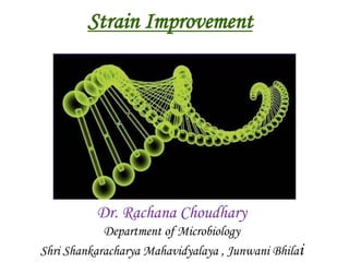 The document discusses strain improvement techniques in microbiology aimed at enhancing the yield of desirable products through methods such as mutation, recombination, and recombinant DNA technology. It highlights the importance of selecting highly efficient strains and provides examples of successful strain improvements, including the production of human insulin. The conclusion emphasizes the broad array of techniques available for optimizing microbial strains for industrial applications.