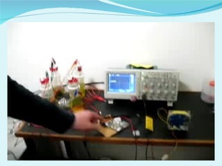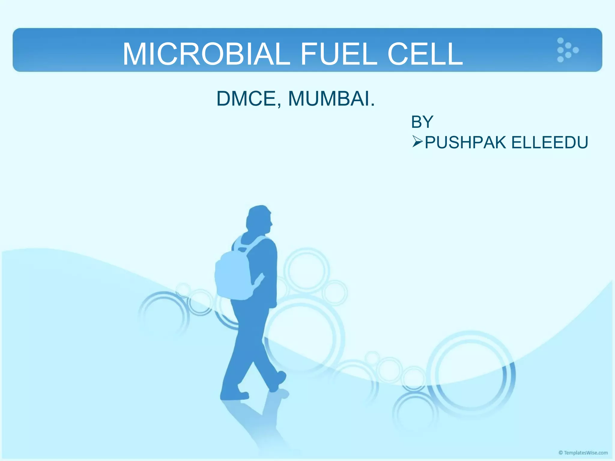 Microbial fuel cells (MFCs) use microorganisms to convert chemical energy from organic matter into electricity. MFCs operate at near-ambient temperatures using microbes that metabolize substrates in wastewater, producing electrons that are harvested to generate electricity. MFCs consist of an anode and cathode separated by a proton exchange membrane, with microbes in the anaerobic anode chamber and oxygen in the aerobic cathode chamber. While MFCs show potential for renewable energy generation and wastewater treatment, challenges remain in improving power output and economic viability at scale.