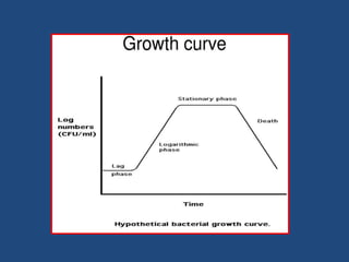 Microbial growth refers to the growth of a microbial population through cell division, not the growth of individual cells. Environmental factors like temperature, pH, nutrients, and oxygen levels influence the growth rate. Bacteria divide through binary fission and the population increases exponentially over time. A bacterial growth curve shows four phases: lag phase, logarithmic growth phase, stationary phase, and death phase. Microbes require water, carbon sources, nitrogen, sulfur, phosphorus, minerals, and optimal pH and temperature to grow. Their oxygen requirements classify them as aerobic, anaerobic, or facultative. Batch, continuous, synchronous, and diauxic growth describe different patterns of microbial population growth over time. Physical and chemical antimicrobial agents