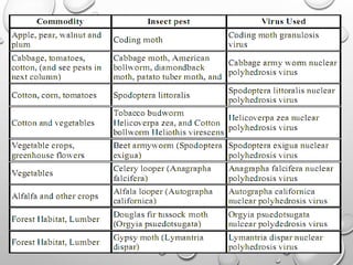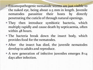Microbial insecticides offer an alternative to synthetic chemical insecticides for pest control. They include bacteria like Bacillus thuringiensis (Bt), fungi, viruses, protozoa, nematodes, and actinomycetes. Bt is the most widely used and produces crystal proteins that are toxic once ingested by the target insect. Other common microbial insecticides include Beauveria bassiana, Metarhizium anisopliae, nuclear polyhedrosis viruses, and the actinomycete insecticides avermectins, milbemycins, and spinosad. Microbial insecticides have advantages like being non-toxic to humans and wildlife but also have disadvantages like being pest-