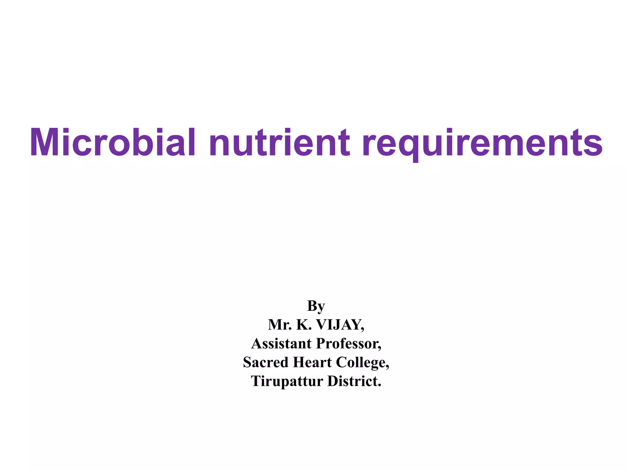 Microbial nutrient requirements refers to the chemicals and elements utilized by bacteria for growth, called nutrients. Bacteria require macroelements like carbon, oxygen, hydrogen, nitrogen, sulfur, phosphorus, potassium, calcium, magnesium, and iron which make up over 95% of bacterial cell dry weight. They also require micronutrients like manganese, zinc, cobalt, molybdenum, nickel, and copper in smaller amounts. A balanced mixture of all required nutrients is necessary for bacterial growth, as a shortage of any essential nutrient will limit growth.