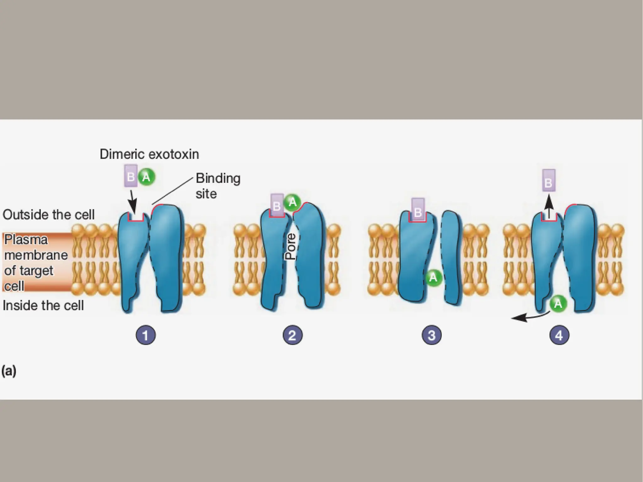 ● (1)- AB toxin1, B portion of the toxin binds to a