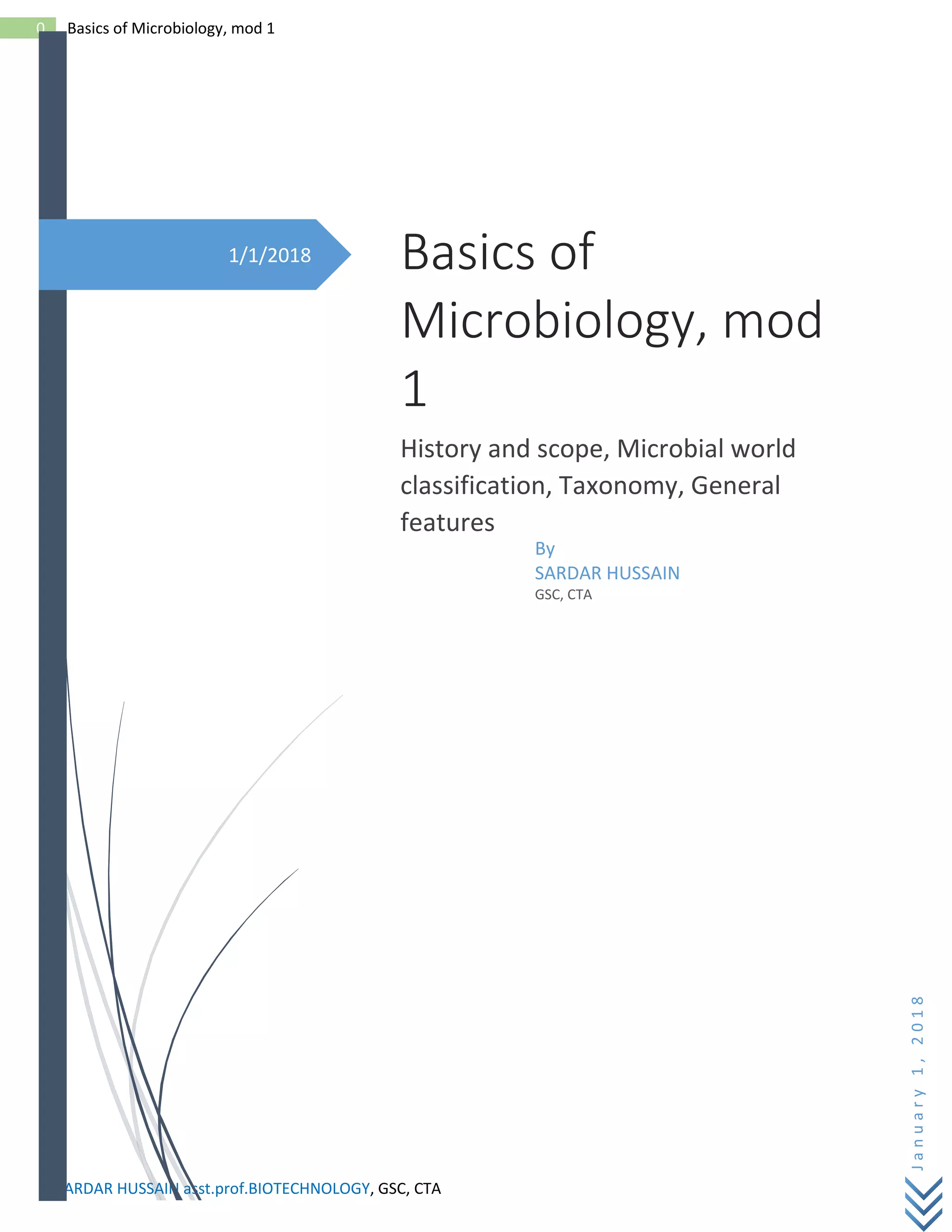 The document outlines the basics of microbiology, detailing the history, significance, and classification of microorganisms including their roles in medicine, biotechnology, and ecology. It covers historical milestones in microbiology, key figures, and fundamental concepts such as the cell theory, germ theory, and advances in genetic engineering. The document emphasizes the impact of microorganisms on various fields, including genetics, agriculture, and industry, highlighting their diversity and ecological importance.