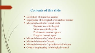 This document provides an overview of microbial control. It defines microbial control as using pathogenic microbes to control pests like insects, animals and weeds. It discusses various microbial agents used for control including bacteria like Bacillus thuringiensis, viruses, fungi, and protozoa. The importance and mechanisms of these different agents are described. The document also discusses using microbes to control animal pests, weeds, cyanobacterial blooms, and the potential for genetic engineering to improve biological control approaches.
