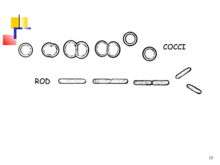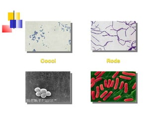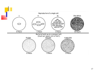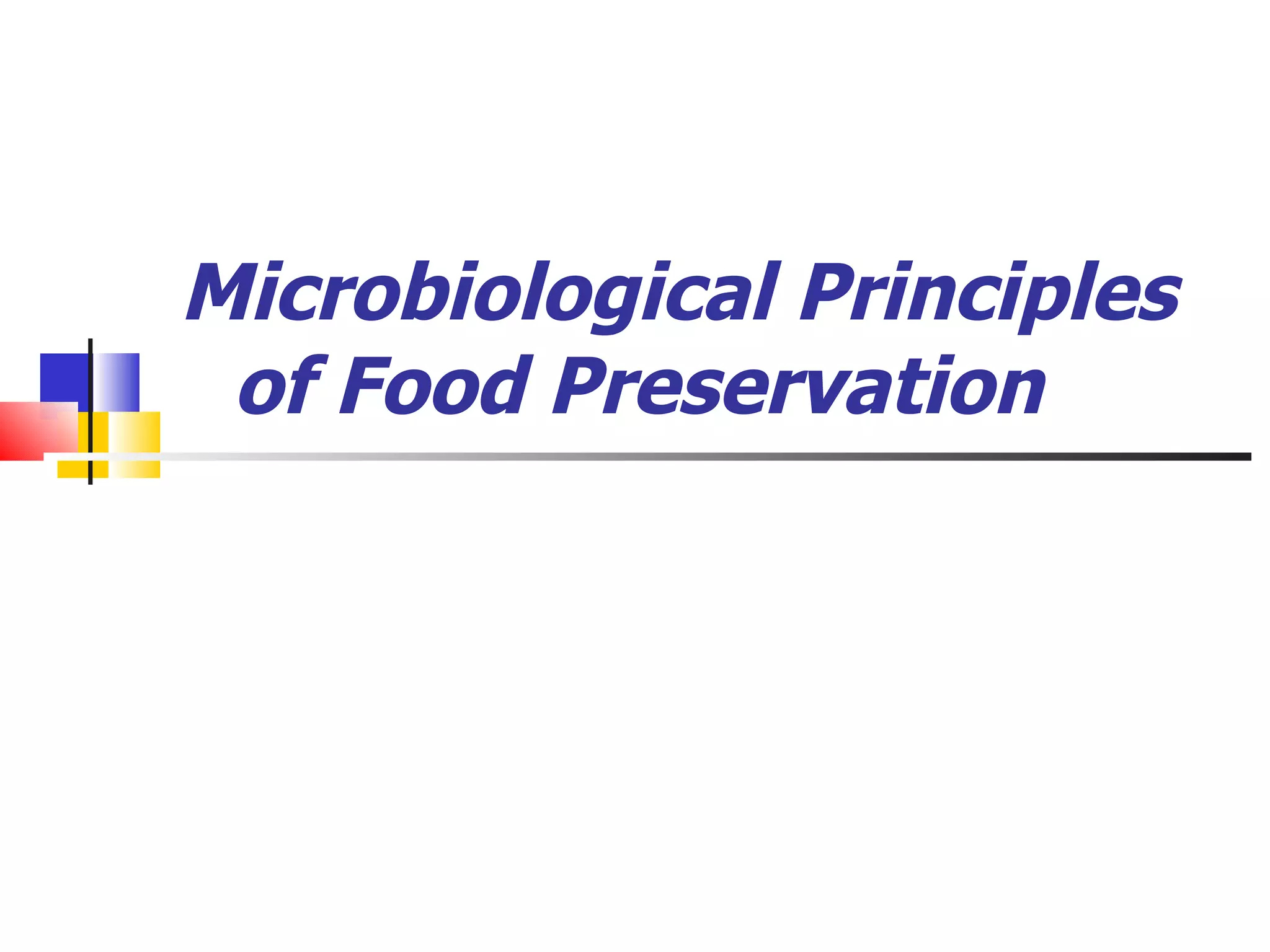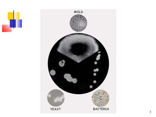 The document discusses different types of microorganisms that can be found on foods, including bacteria, molds, and yeasts. It describes their structures, modes of reproduction, and optimal temperature and moisture conditions for growth. Several pathogens that can cause foodborne illness are also identified. Food preservation aims to prevent spoilage and ensure safety by controlling factors like pH, water activity, temperature, and oxygen levels that influence microbial growth.