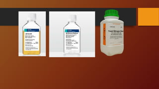 The document covers various types of microbial media used in microbiology, categorizing them into natural, synthetic, complex, selective, differential, indicator, enriched, and enrichment media. Each type of media serves specific functions for culturing microorganisms, with detailed examples and applications, such as nutrient agar for general culturing and MacConkey agar for isolating gram-negative bacteria. Additionally, it discusses the importance of nutrient composition and the role of specific indicators in distinguishing between microbial species.