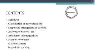 The document provides an overview of microbiology, focusing on the study of microorganisms, specifically bacteria, including their classification, shapes, anatomy, and isolation methods. It also details various staining techniques such as Gram staining and acid-fast staining, which are essential for identifying and differentiating bacterial species. Methods for isolating bacteria, including various plating techniques and specimen collection protocols, are outlined to ensure accurate diagnosis of infections.