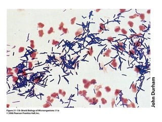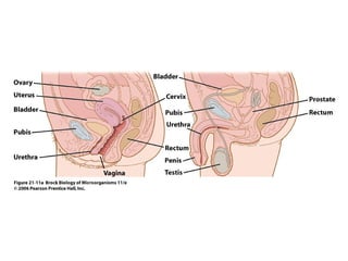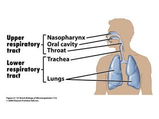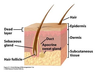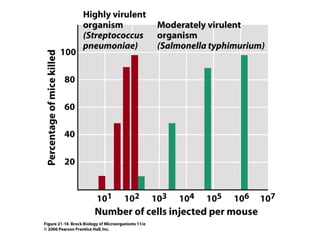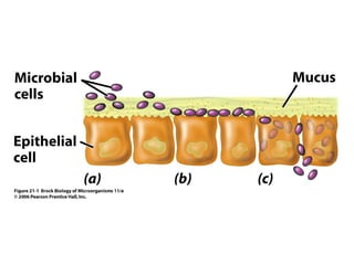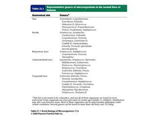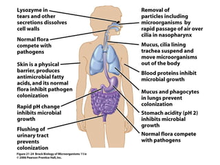 This document summarizes a chapter from a biology textbook about microbial interactions with humans. It covers both beneficial microbes that normally inhabit the body and potential pathogens. For beneficial microbes, it describes the normal flora of the skin, oral cavity, gastrointestinal tract, and other body areas. It then discusses how pathogens can potentially cause harm by entering the host, colonizing tissues, and using virulence factors like toxins. Lastly, it covers host defenses against infection and factors that increase infection risk.