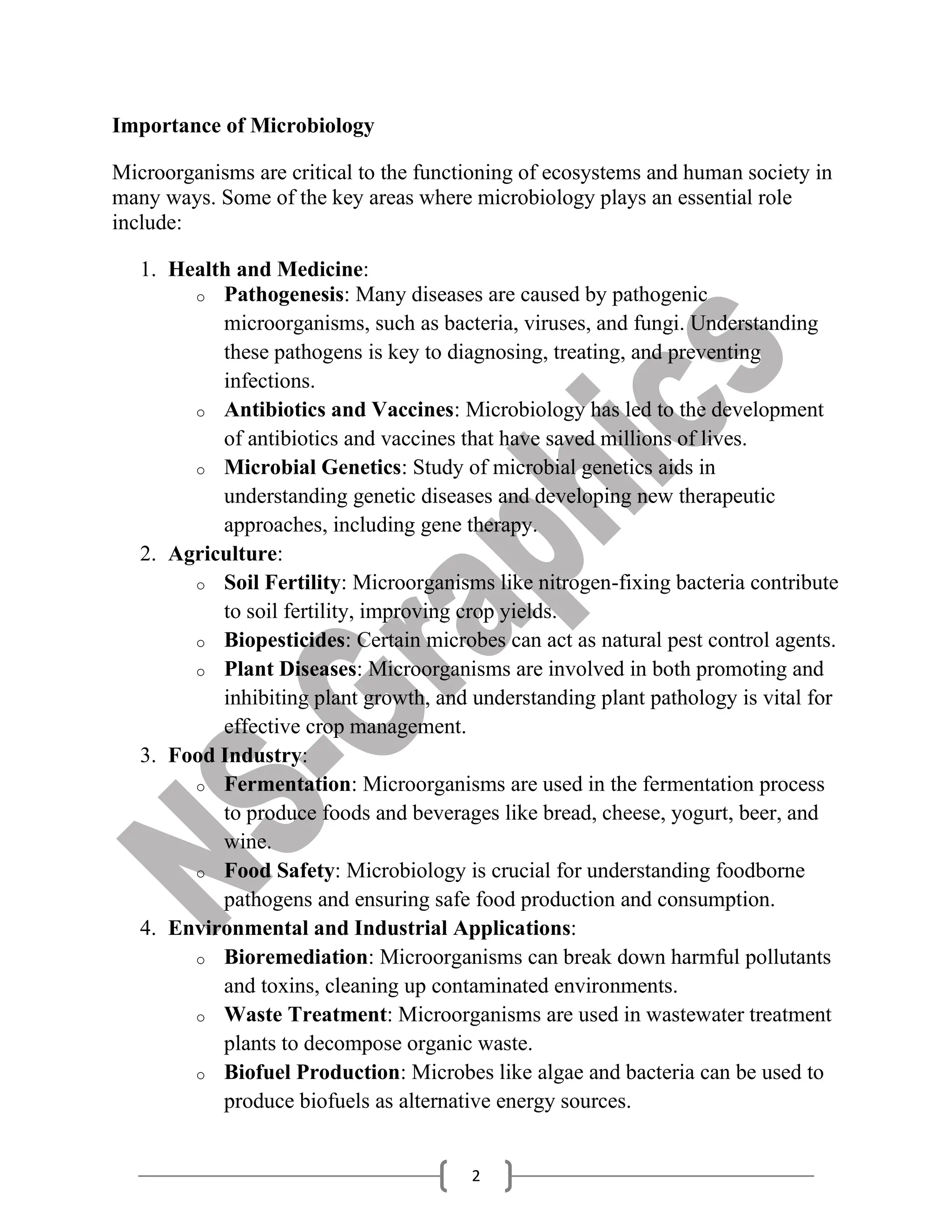 Microbiology is the study of microorganisms, which include bacteria, viruses, fungi, and more, focusing on their structure, function, and interactions with the environment. The field encompasses various sub-disciplines like bacteriology, virology, and mycology, and plays a crucial role in health, agriculture, food industry, and environmental applications. Historical development highlights key figures like Louis Pasteur and Alexander Fleming, while classification systems categorize microorganisms based on characteristics such as cellular organization, metabolism, oxygen requirements, and morphology.