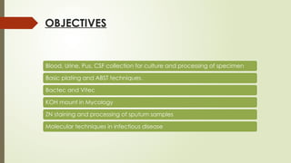 The document outlines microbiology laboratory procedures for specimen collection and processing, including blood, urine, pus, cerebrospinal fluid (CSF), and stool. It details various techniques such as Gram staining, automated blood culture systems (Bactec and Vitek), and molecular methods for diagnosing infectious diseases. Additional information covers culture media used, antibiotic susceptibility testing, and identification of pathogens through biochemical tests.