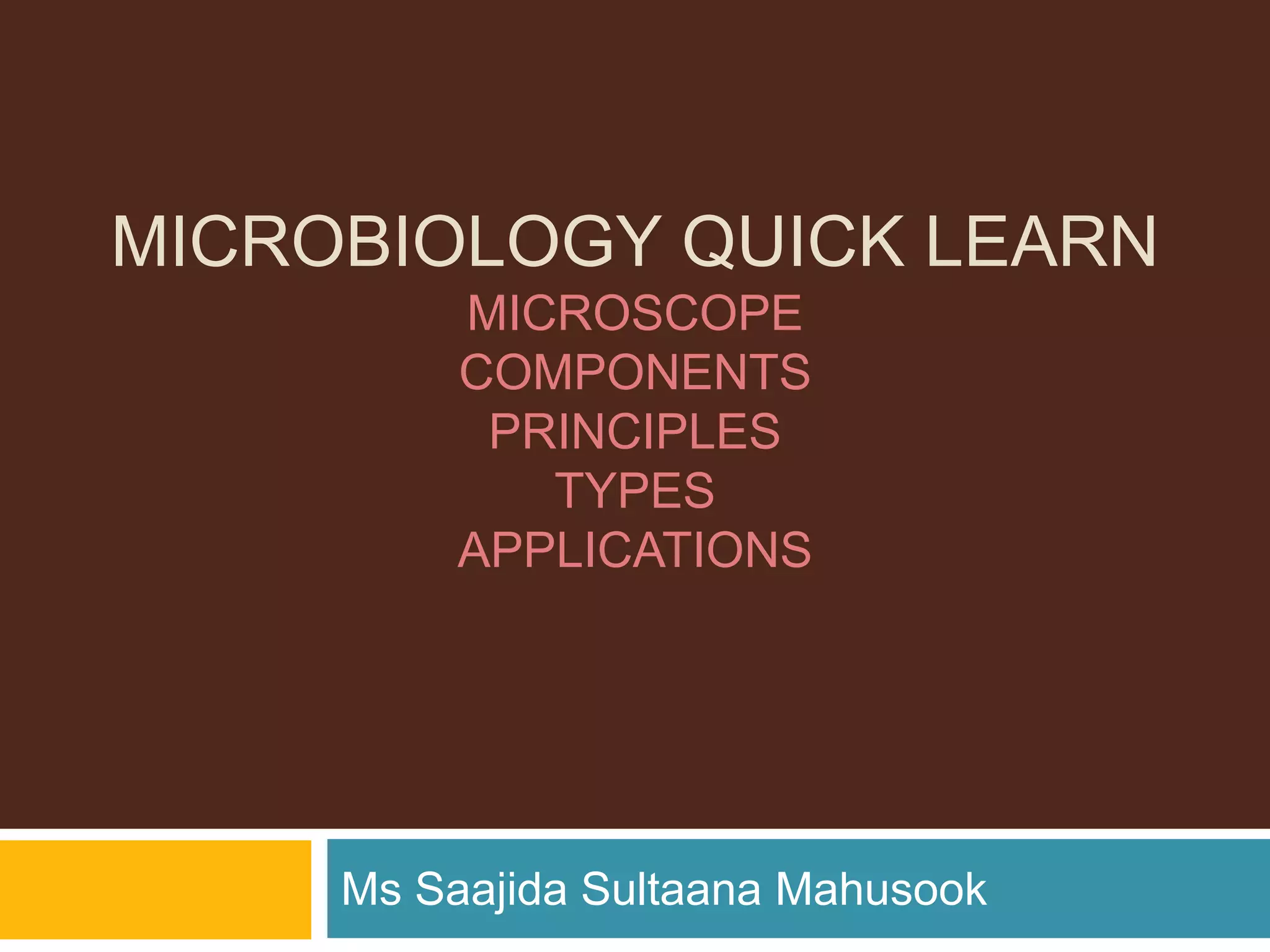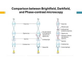 The document discusses different types of microscopes, their components, principles, and applications. It describes light microscopes like brightfield, darkfield, phase-contrast, and fluorescent microscopes. It also covers electron microscopes. Brightfield microscopes illuminate specimens with light against a bright background. Darkfield microscopes deflect light to view specimens brightly against a dark background. Phase-contrast and fluorescent microscopes use special optics and fluorescent dyes to view unstained or tagged specimens. Electron microscopes use electron beams instead of light for magnifications over 1 million times.