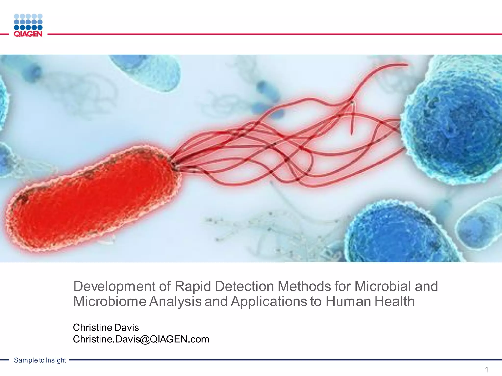 This document discusses the development of rapid detection methods for microbial and microbiome analysis and their applications to human health. It provides an overview of QIAGEN's microbial qPCR products and discusses focused metagenomics applications like screening for antibiotic resistance genes in the food supply and human gut. Limitations of current methods are outlined and the benefits of qPCR for rapid, specific, and sensitive microbial detection are described.