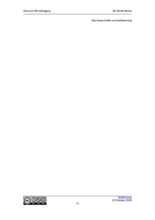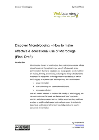 This document discusses how microblogging platforms like Twitter and Facebook can be used for educational purposes. It defines microblogging as broadcasting short, real-time messages. The document introduces Twitter and Facebook, explaining their basic features. It then discusses how educators could use microblogging to share information, build community and collaboration, and encourage reflection among students.