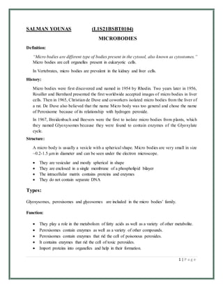 Microbodies are small organelles found in eukaryotic cells, playing vital roles in metabolism, particularly in the kidney and liver. They include types such as peroxisomes and glyoxysomes, which are involved in processes like fatty acid oxidation and the conversion of stored lipids into carbohydrates. The document outlines their structure, function, history, and relation to various diseases, notably Zellweger syndrome linked to peroxisomal dysfunction.