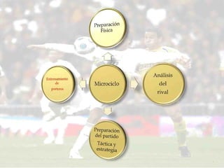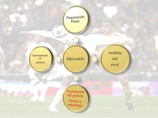 El documento describe la planificación y organización del entrenamiento táctico de un equipo de fútbol a lo largo de una semana. Se detallan las sesiones de entrenamiento táctico de cada día, incluyendo análisis post-partido, entrenamiento pre-partido, repaso táctico, estrategia ofensiva-defensiva, y charlas pre- y post-partido.