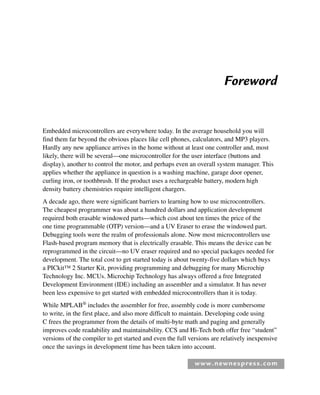 This document provides an introduction and overview of embedded microcontrollers and the process of learning to program them. It discusses how microcontrollers are now found in many everyday appliances and products. It describes how the cost of getting started with microcontroller development has decreased significantly in recent years, with microcontrollers now having electrically erasable program memory and low-cost development kits available. It promotes C as a programming language that is better than assembly for microcontroller programming, being more readable and maintainable. The document introduces a book that guides readers through developing microcontroller applications in C from basic to complex using the PIC16F877A microcontroller, MPLAB IDE, and Proteus simulation software.
