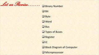The document provides an overview of fundamentals related to microcontrollers including the 8051 microcontroller. It defines common terms like binary number, bit, byte, word, bus, register, integrated circuit, and microprocessor. It then discusses the 8051 microcontroller specifically, covering its memory organization, I/O ports, timers, interrupts, and special function registers. The document is intended as a revision guide for understanding basic microcontroller concepts centered around the popular 8051 microcontroller.