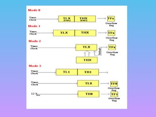 This document provides an overview of the 8051 microcontroller, including its basic components, registers, memory mapping, stack, I/O port programming, timers, and interrupts. It begins with an introduction and block diagram of the 8051 and descriptions of its pins and registers. It then discusses the 8051's memory mapping and stack, as well as how to program its I/O ports, timers, and interrupts. The document also compares microprocessors and microcontrollers, describing the 8051 as a single-chip microcontroller with on-chip RAM, ROM, I/O ports, and other components. It provides examples of the 8051's use in embedded systems for applications requiring low cost, power, and space.