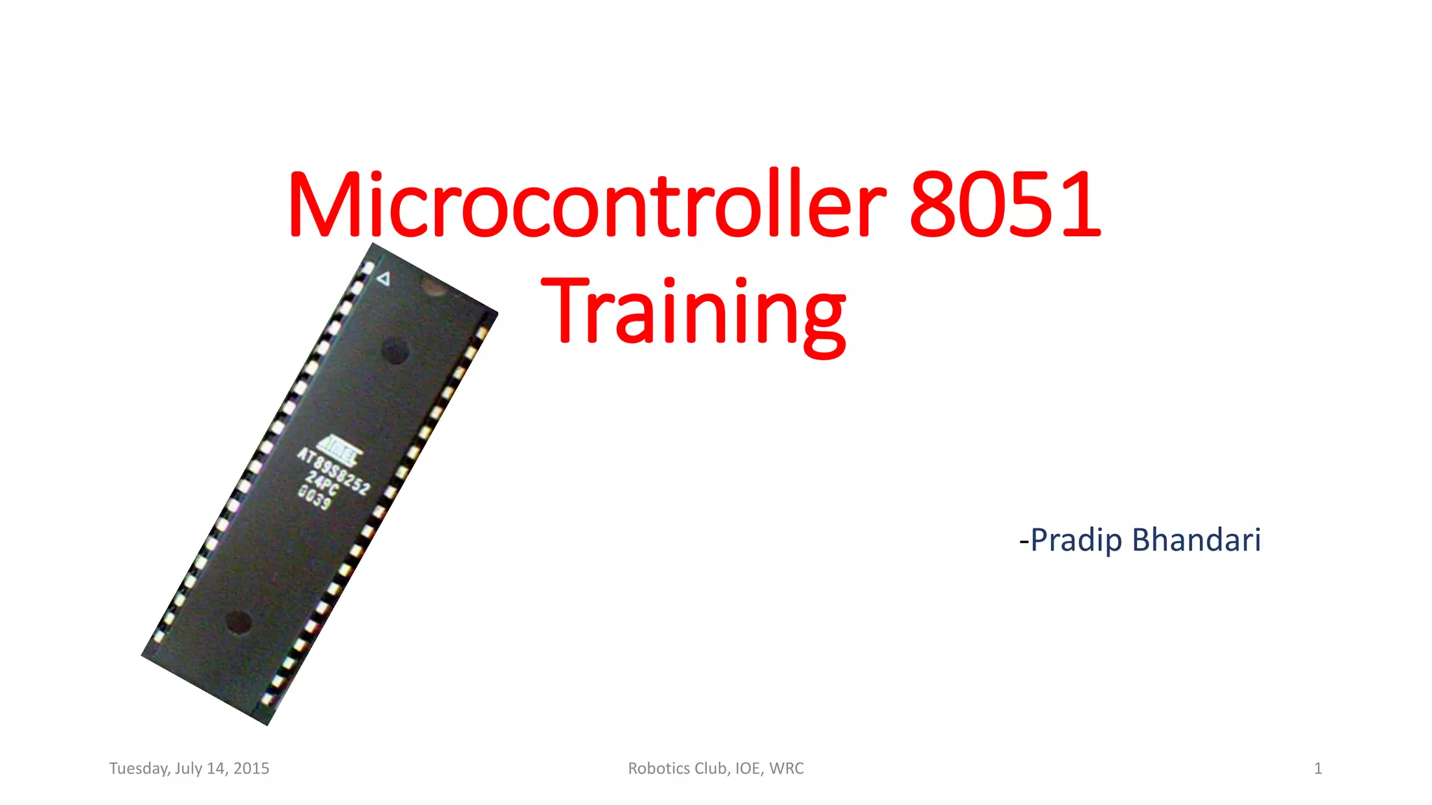 This document provides training on the 8051 microcontroller, covering its architecture, pin descriptions, and basic programming concepts. It includes instructions for setting up the environment using Proteus and Keil, along with practical examples such as creating an LED blink circuit and programming an LCD. Additionally, it discusses the features and comparisons of different versions of the 8051, including environment setup and programming workflows.