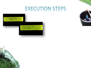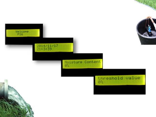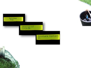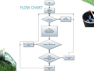 This document describes an advanced irrigation system using a soil moisture sensor to conserve water. The system uses a microcontroller and soil moisture sensor to automatically water plants only when needed. It measures the soil moisture level and compares it to a threshold value set by the user. If the soil is dry (below the threshold), a relay is activated to supply water. This removes the need for manual intervention by farmers and helps save up to 60% of irrigation water typically wasted through over-watering. The system guide includes the code and wiring diagram to build the automated irrigation system.