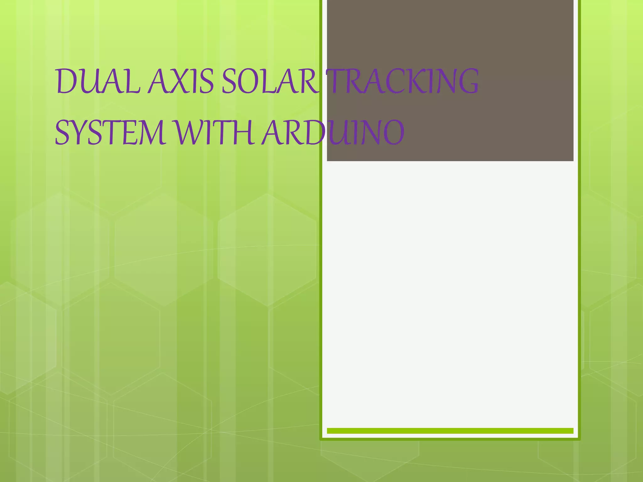This document describes a dual axis solar tracking system using an Arduino microcontroller. It discusses the components used including LDR sensors to detect light levels, a DC motor and driver to adjust the solar panel positioning, and an LCD display to show the panel orientation. The Arduino reads the LDR sensor values and controls the motor driver to keep the solar panel oriented towards the sun for maximum energy generation.