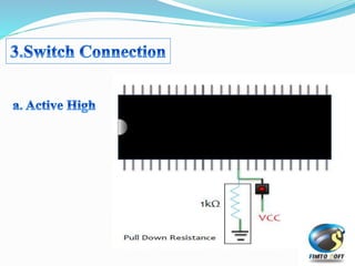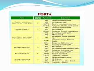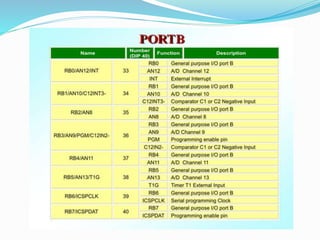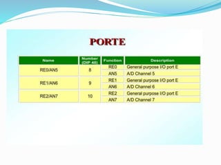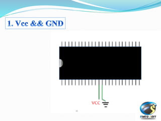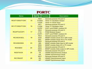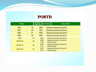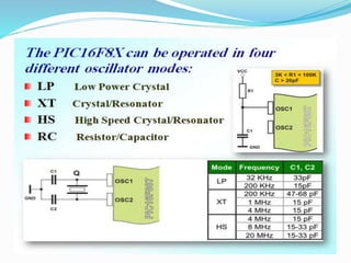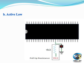 The document discusses the architecture of microcontrollers. It describes the hardware components of the PIC16F877A microcontroller, including its I/O ports, power supply connections, and reset button. It also outlines the main connections, software requirements including Proteus, Micro C Pro and a burner program, and hardware requirements such as a PC, programmer, and other electronic components needed to interface with the microcontroller.