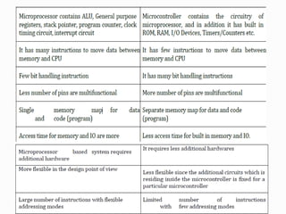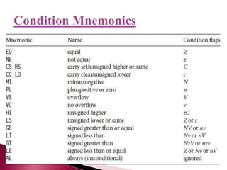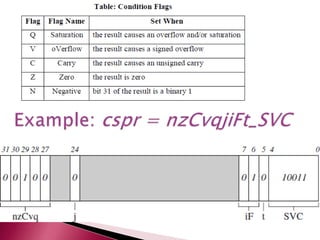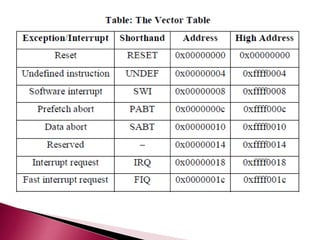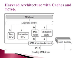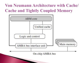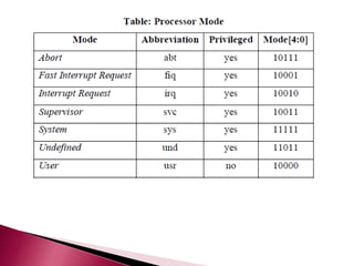 The document provides information about RISC processors and the ARM architecture. It discusses key aspects of RISC design including simple instructions that can execute in a single cycle, pipelining of instruction execution, large general purpose registers, and separate load and store instructions. It also describes features of the ARM architecture like variable cycle instructions, a barrel shifter, conditional execution, and the Thumb instruction set. Additionally, it covers ARM embedded system basics, the ARM design philosophy, and software components like initialization code, operating systems, and applications.
