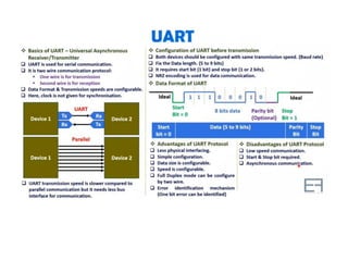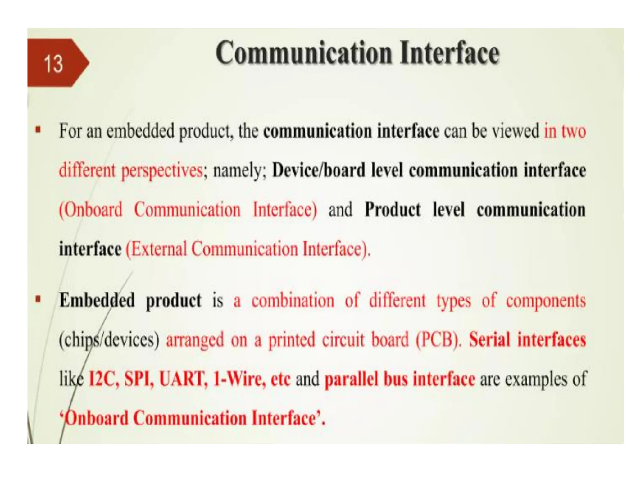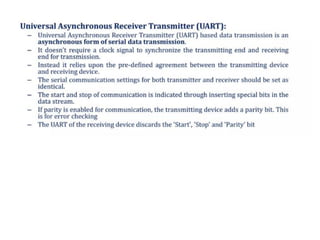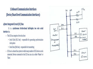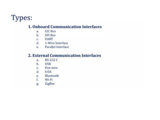The document discusses communication interfaces, specifically focusing on RS-232 and USB protocols. RS-232 is highlighted as the recommended standard number 232 for external communication. It outlines the significance of these interfaces in connectivity.