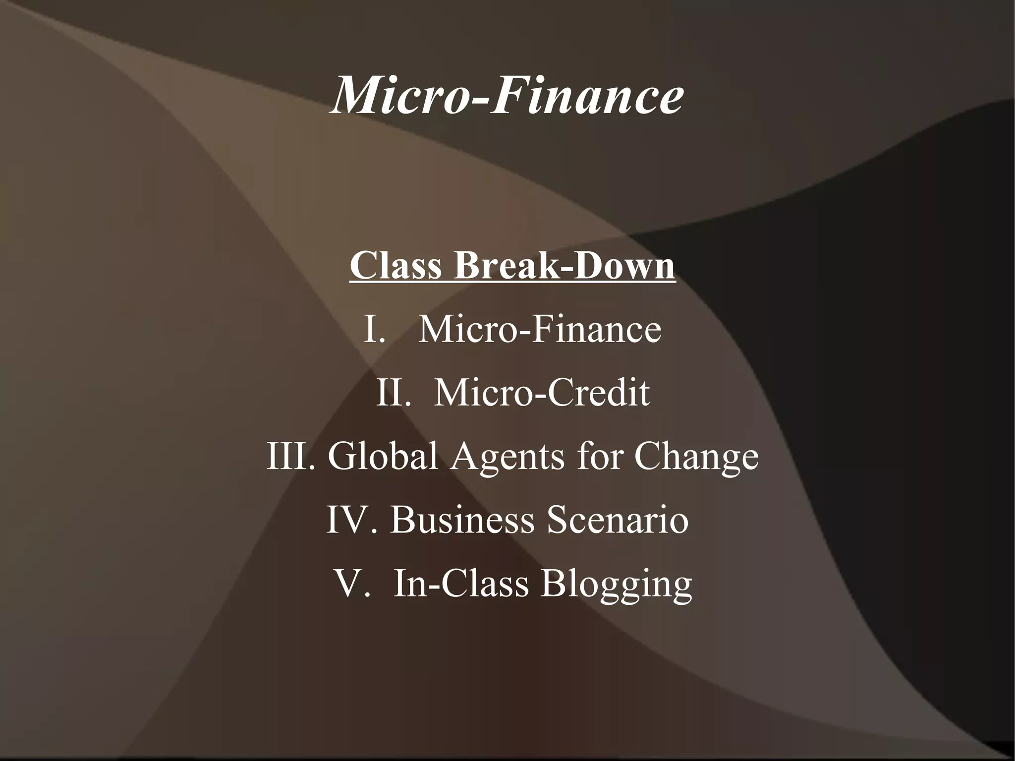 Micro-finance provides small loans and other financial services to low-income individuals who do not have access to traditional banking services. It has helped many people start small businesses and increase their incomes. However, some argue that interest rates on micro-loans are sometimes too high and micro-finance does not address the underlying structural causes of poverty. The document discusses different models of micro-finance organizations and provides examples of how micro-loans have helped individuals and families in developing countries.