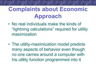 1) The document discusses the economic model of utility maximization and choice under budget constraints. It outlines some complaints about the model but also notes the model predicts behavior even without individuals consciously carrying out calculations.