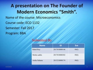 This presentation summarizes key concepts from Adam Smith's work, including the division of labor, the invisible hand, and laissez-faire. It will cover Smith's analysis of the industrial revolution, how specialization increases productivity, and how free markets can benefit society through individuals pursuing self-interest. The presentation was created by three students for a fall 2017 microeconomics course on the founder of modern economics.
